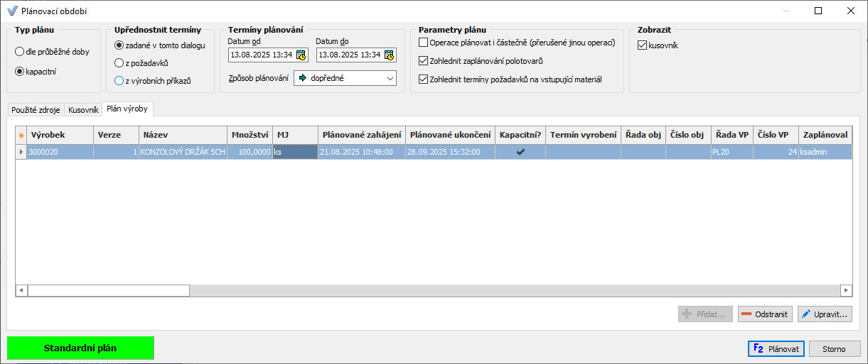 | • | tyto zdroje musí mít zaškrtnut parametr použití ve výrobě a musí mít vyplněný kapacitní kalendář |