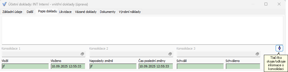 Nahoře lze vložit libovolný delší text, popisující doklad. Dole se zobrazují informace o konsolidaci, které, pokud nejsou pro uživatele důležité, mohou být překryté polem pro text, to řídí tlačítko se šipkou. Dále se dole zobrazují informace o tom, kdo vložil doklad, kdo naposledy doklad změnil a kdo a kdy doklad schválil. Informace o schválení byla původně umístěna na záložce Další, souvisí s funkcí schvalování . Není nutné zakládat při rozpisu jednoho analytického účtu na střediska či činnosti... více zápisů v deníku, ale je nutné jeden zápis v deníku na členění rozepsat přímo v položce deníku. formulář rozpisu na střediska