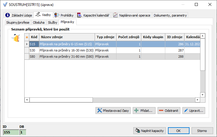 Přípravky .. v této záložce je uveden seznam všech přípravků, které mohou být na daném zdroji použity. Pokud je takových přípravků více, je možno pořídit tabulku přestavovacích časů udávajících čas potřebný pro výměnu jednoho přípravku za druhý. Takovou tabulku je možno vytvořit pomocí tlačítka Přestavovací časy (více viz Popis plánovacího algoritmu - Přestavovací časy)